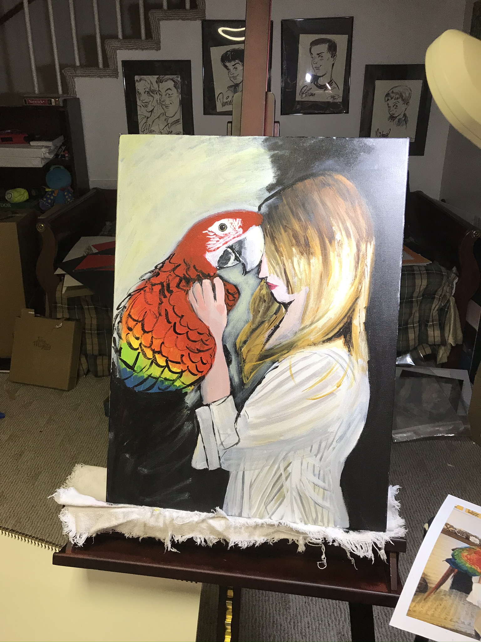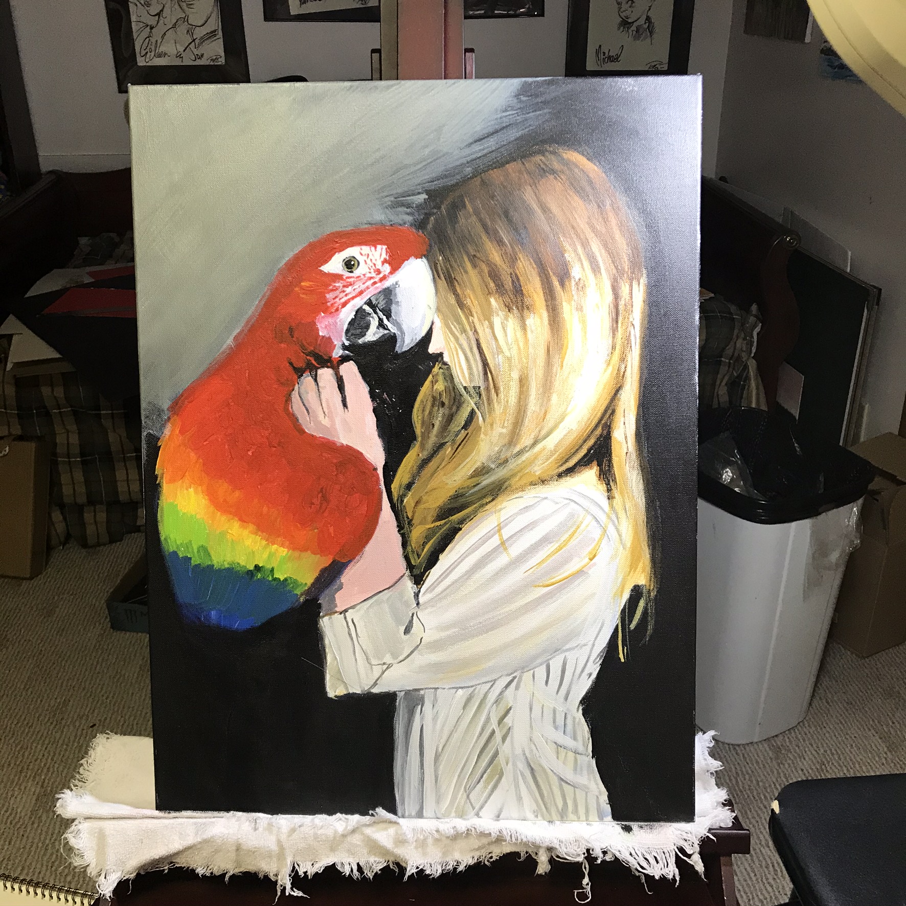So my first blog here is about my most recent commission. I have not done a ton of commissioned work, and it is has always been directly from a photograph. But this case was a little different, in that my client had a clear idea of what she wanted … and sent me 4 pictures to try to put it together. She wanted a painting of her friend Jenny with her pet mackaw Tedi. Tedi had recently passed, and so the painting was to be a memorial. Here are the four pictures she sent: